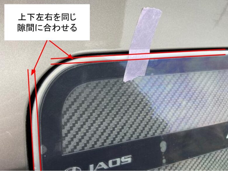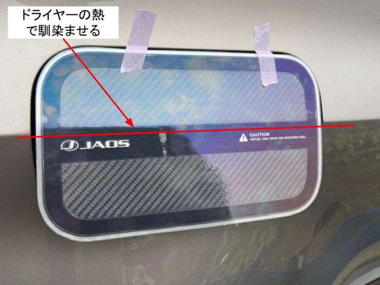 透明のアプリケーションシートをフューエルリッド(給油口)の形状に、上下左右同じ隙間になるように合わせて、マスキングテープで留めます。