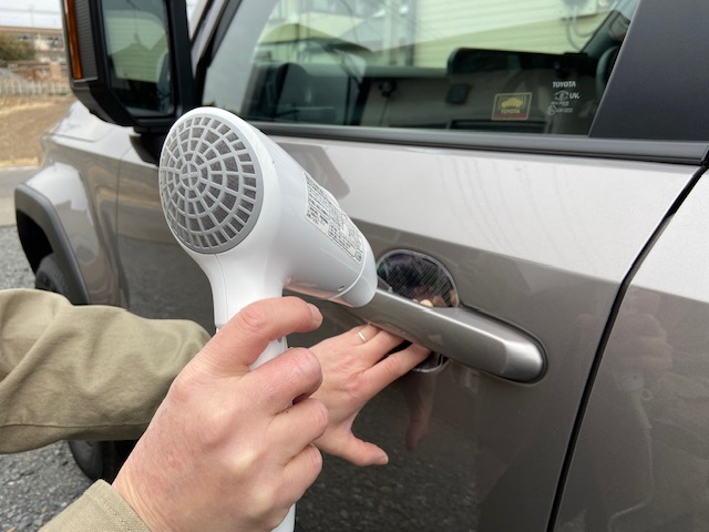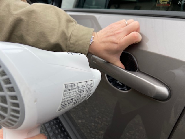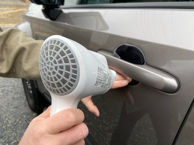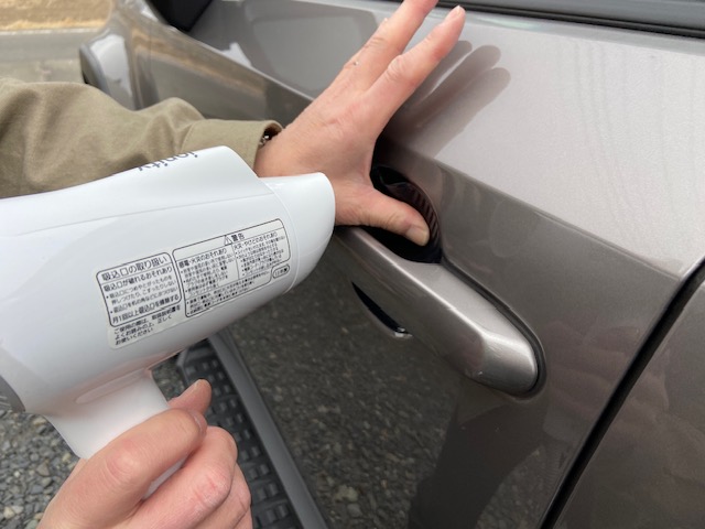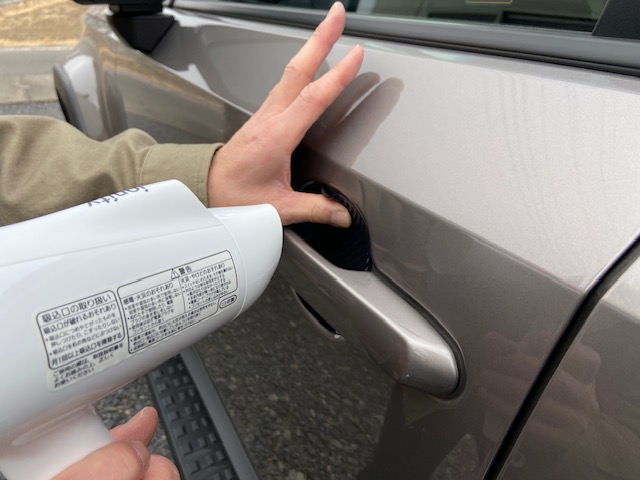 ドライヤーの熱でドアプロテクターをドアハンドルの形状(くぼみ)に馴染ませます。
