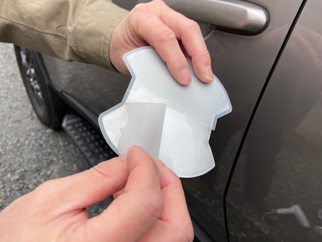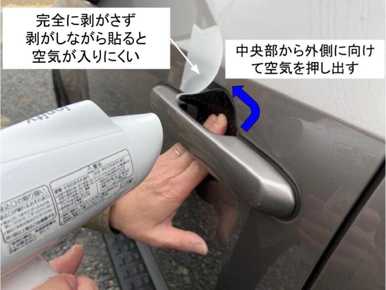 次に下側の接着面の保護フィルムを剥がして、ドアハンドル部に合わせます。