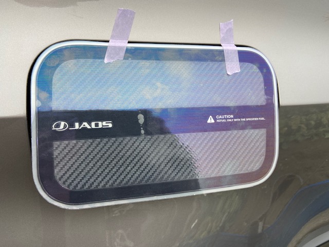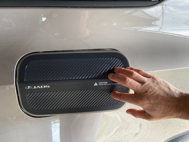 フューエルリッドの形状に合わせた専用設計、シンプルなカーボン調のデザインですが、設置面積が大きいので目立ちます。強力な粘着面で、簡単に剥がれなく貼付けることができました。