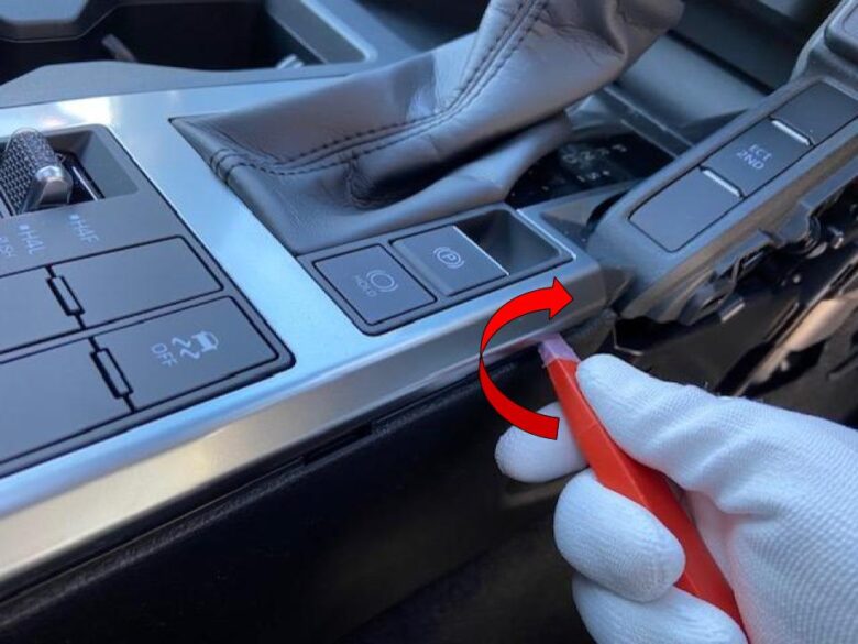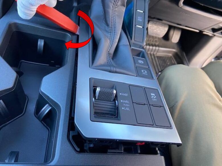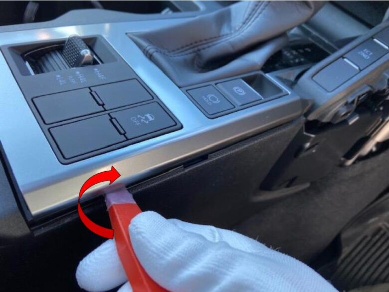 右手前側から内張り剥がしを入れ、ねじってクリップかんごう外します。