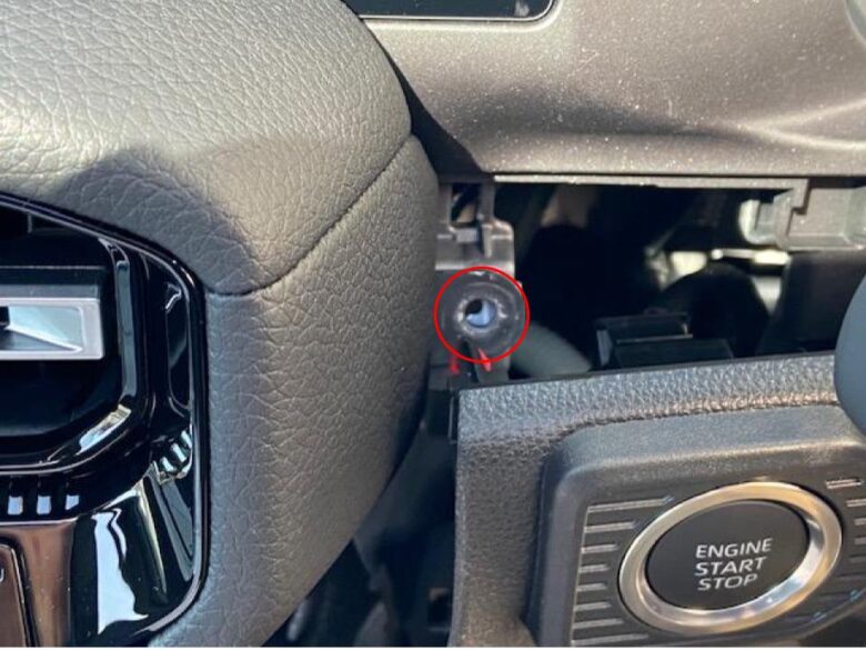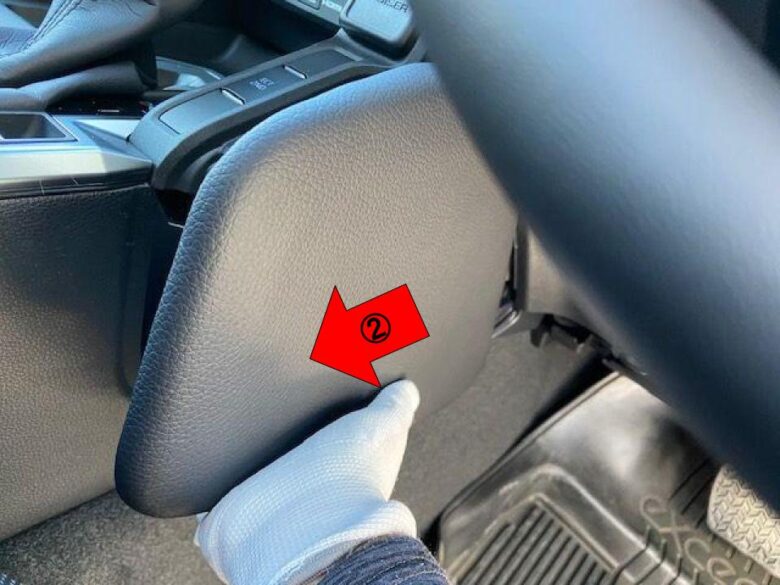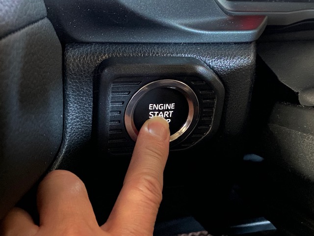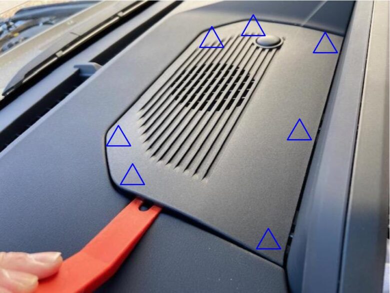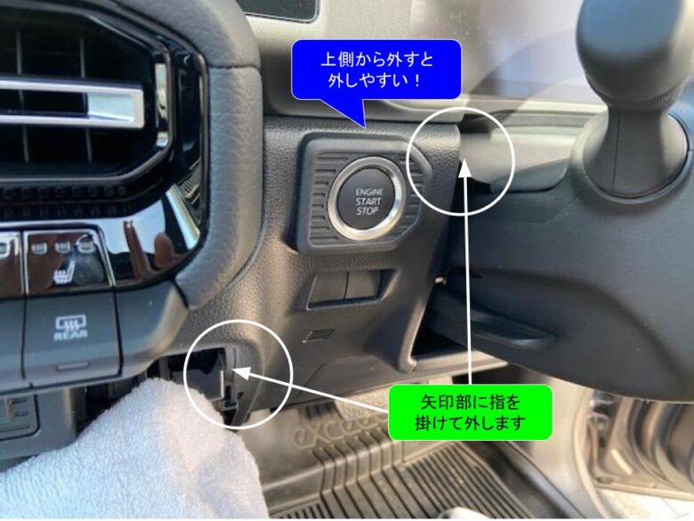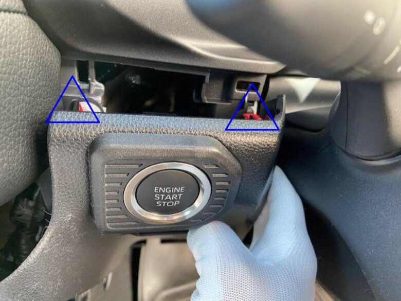 エンジンスタートボタンの上側の青△クリップかんごうを先に外します。