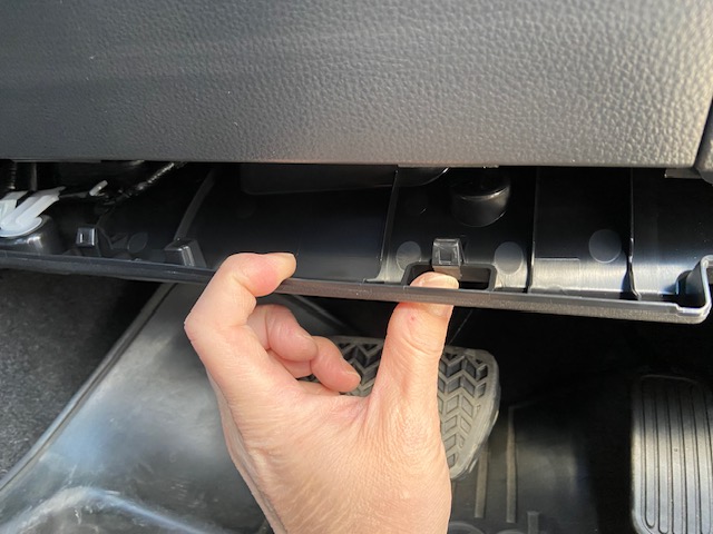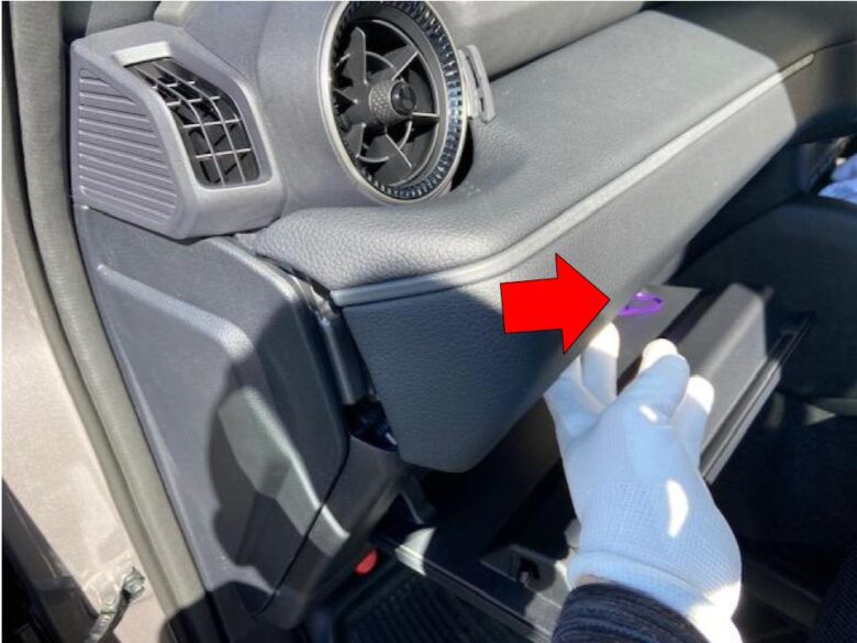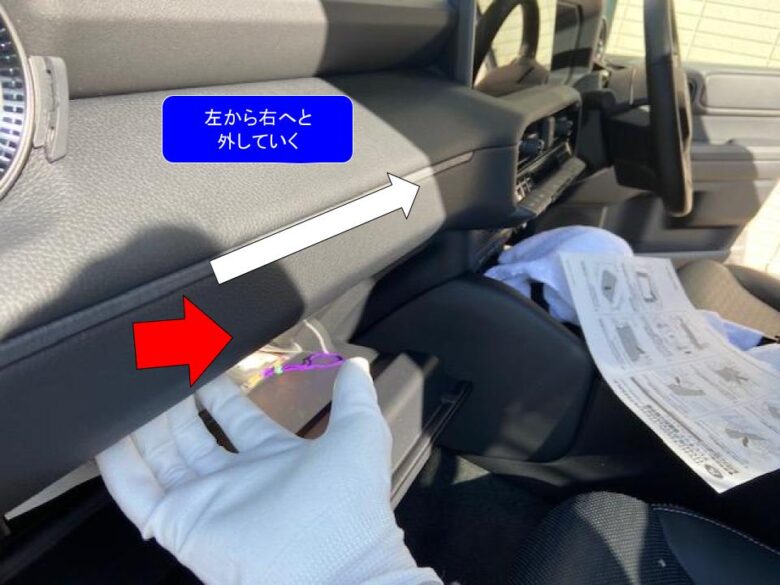 グローブボックスを開けて、エアコンインパネガーニッシュの下側に手を掛けて手前に引いてクリップかんごうを外します。