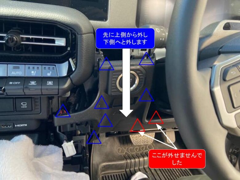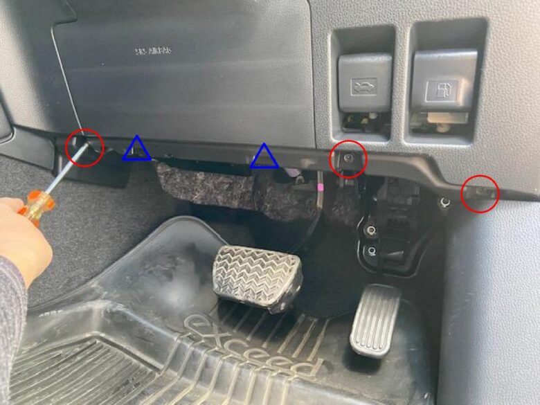 赤◯3本+ネジを外し青△2箇所のツメのかんごう押し外し、インパネアンダーカバーを外す。