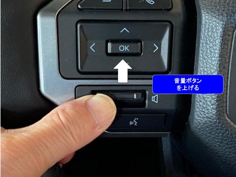 操作方法はエンジン始動、ナビが起動後にステアリングの「音量ボタンを⊖▶⊕」でテレビ操作モードのON/OFF切り替えます。