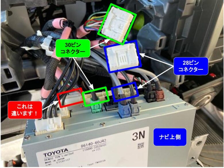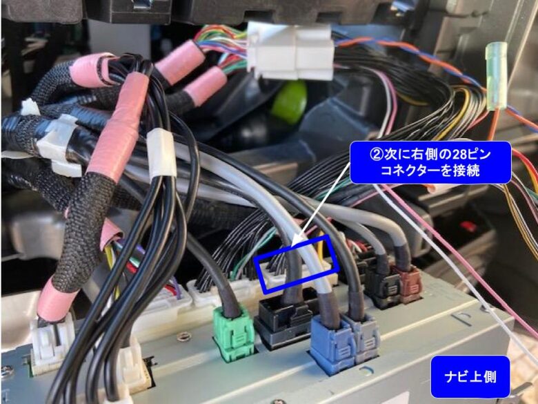赤□左側の28ピンに接続しても、TVキャンセラーの28ピンコネクターがナビ側の28ピンコネクターに接続できません。