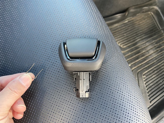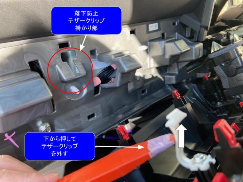 内張り剥がしなどで下側から押して、テザークリップを掛かり部から外します。