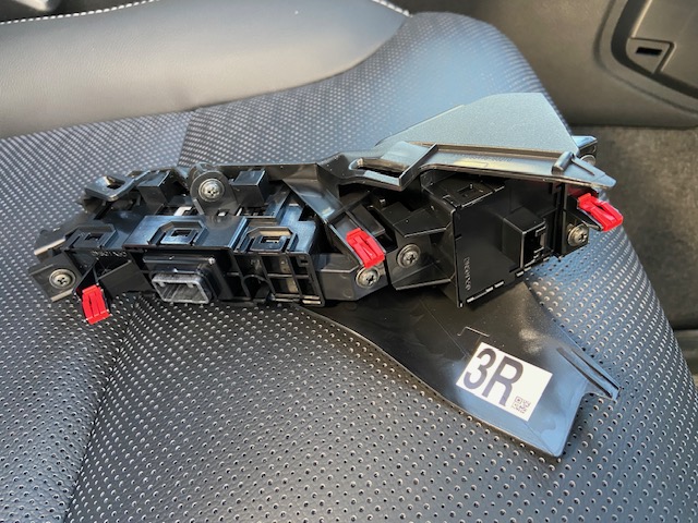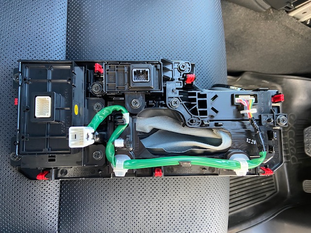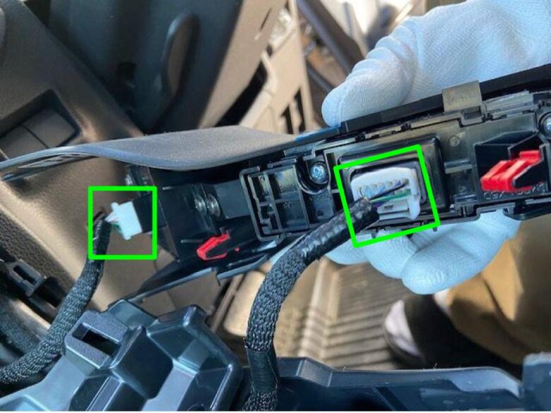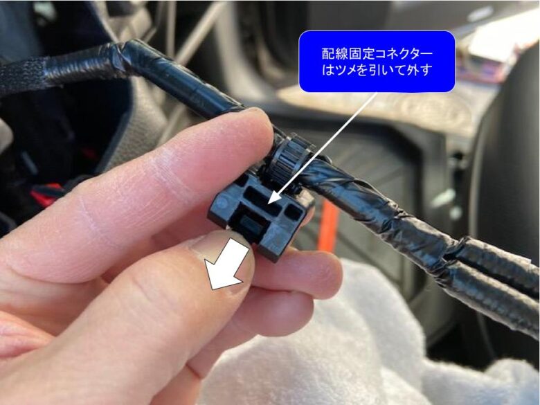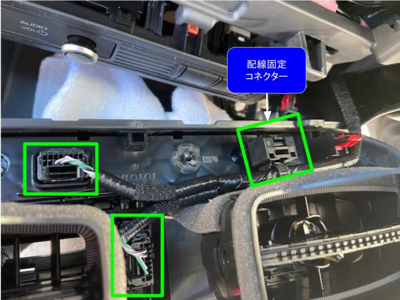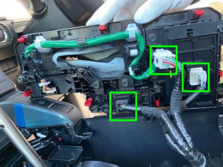 カプラー緑□3箇所を外します。コネクターのツメを押して外します。配線固定コネクターは、ツメを引いて外します。