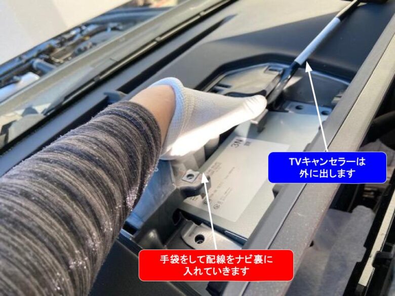 TVキャンセラーを外に出し、ナビ裏のスペースに配線を入れてながらナビを戻していきます。