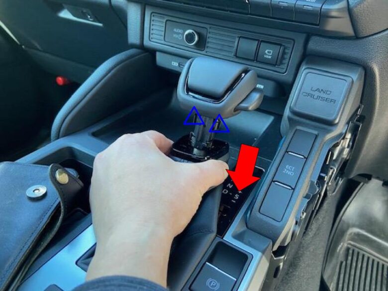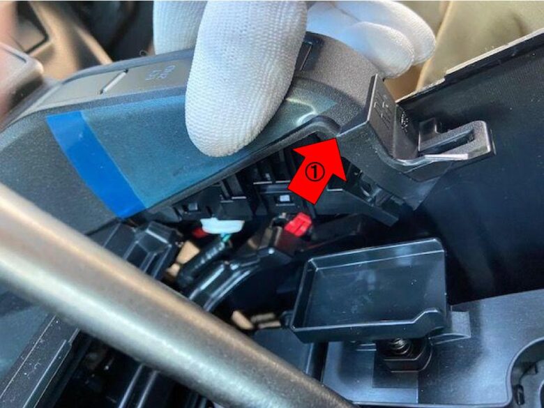 シフトブーツを下げ青△2箇所クリップを外す。
