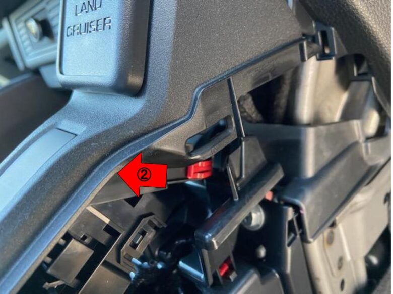 内張り剥がし差し込み青△6箇所クリップかんごうを外し、インパネクラスタアッパーパネルを外します。