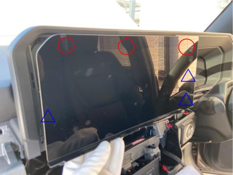 ナビの下側両端に両手を入れて手前に引き、青△3箇所がクリップ、赤◯3箇所ツメを外します。