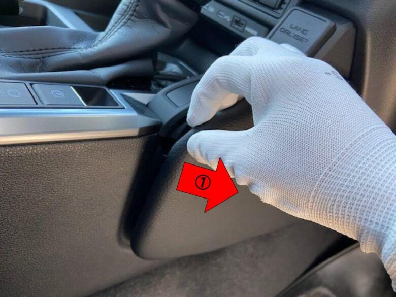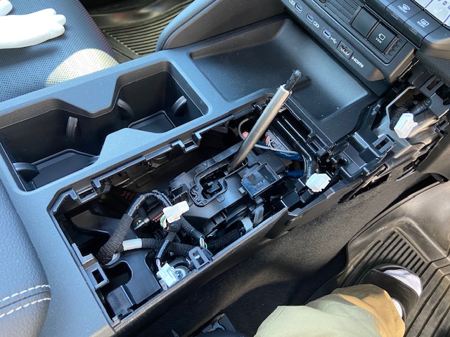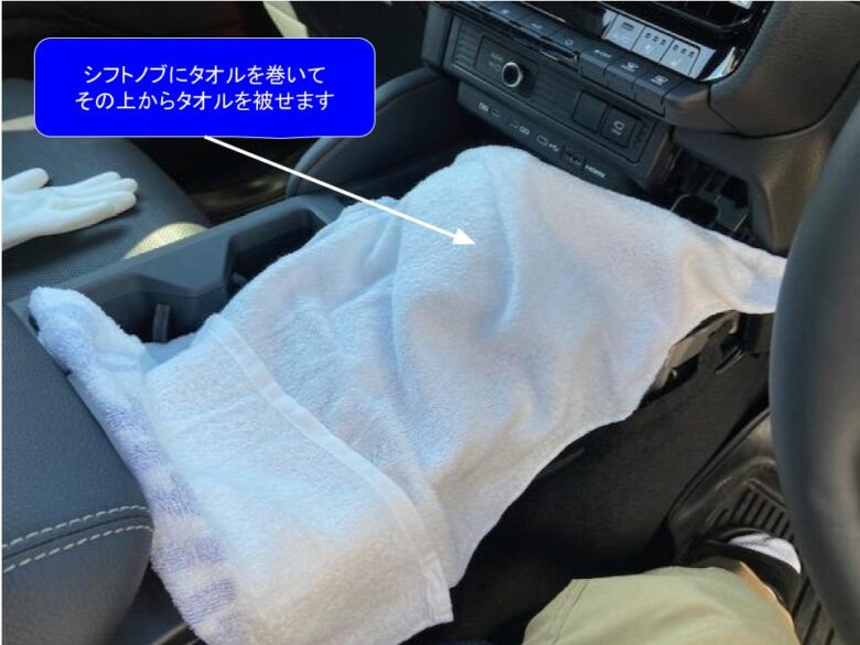 シフトノブ、シフトパネル、コントロールパネルを外し、シフトノブにタオルを巻いてタオルを被せます。