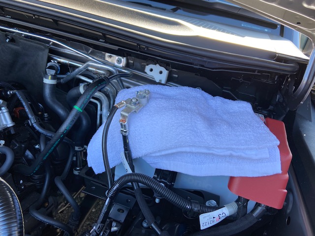 10㍉のソケットレンチで外し、(ー)端子がショーとしないようにタオルを挟みます。