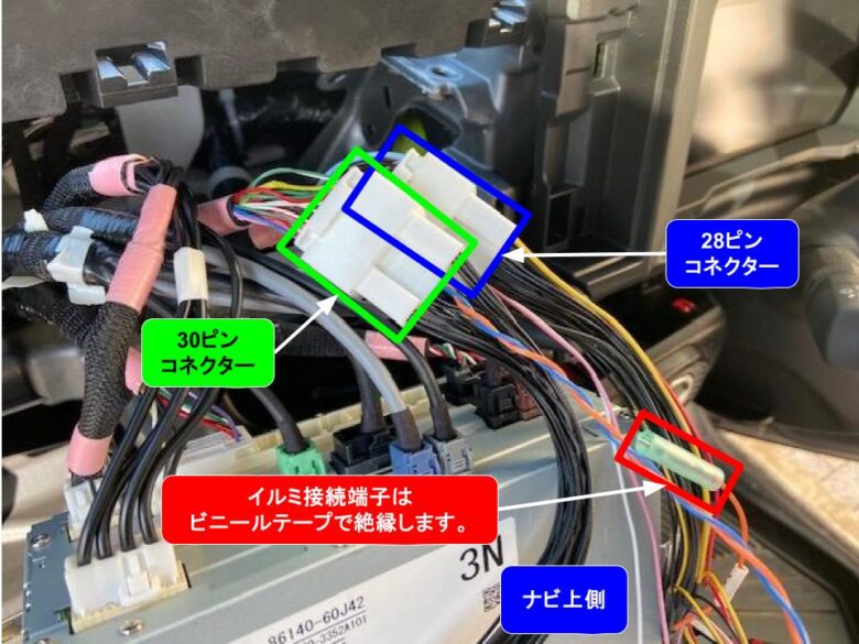 外した配線にTVキャンセラーを接続します。イルミ接続端子はビニールテープで絶縁してください。