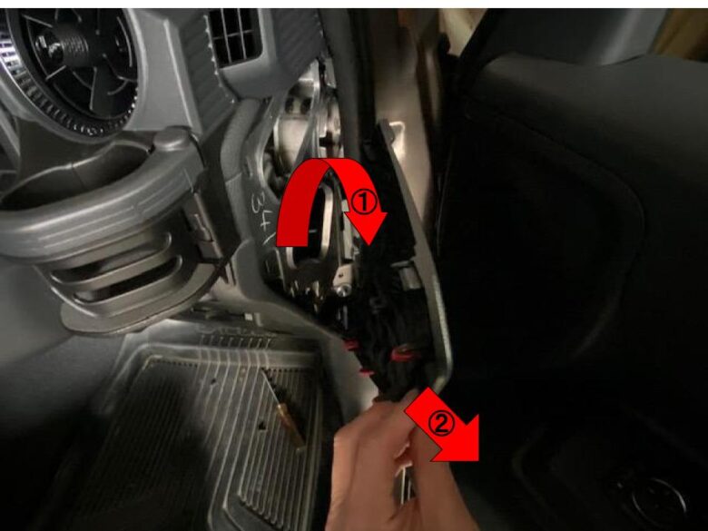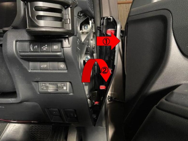 内張り剥がしを入れて①クリップかんごうを外し②手前に倒します。