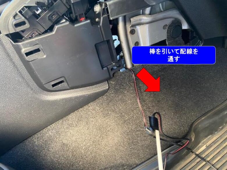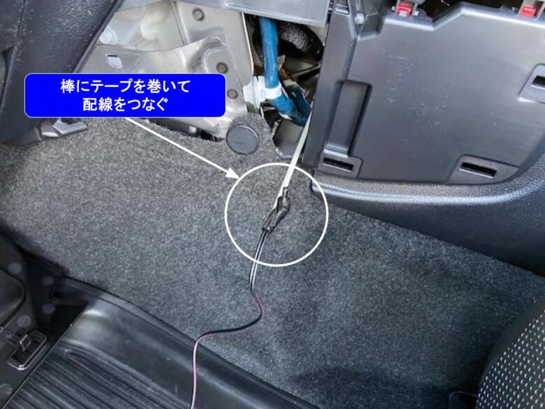 オートマシフトに運転席側から棒を入れ、テープで配線を巻いてつなぎ、棒を引いて配線を通します。