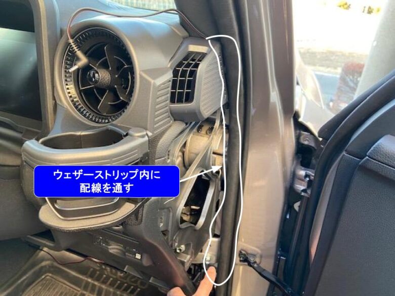 サイドはウェザーストリップ内を通し、エアコン吹き出し口横に出します。