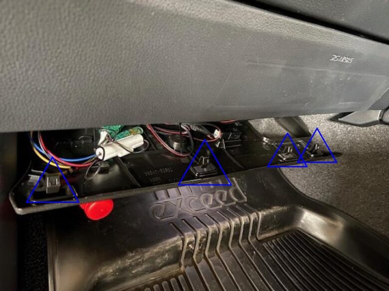赤◯3本+ネジを外し、青△2箇所のツメのかんごう押し外し、インパネアンダーカバーを外す。
