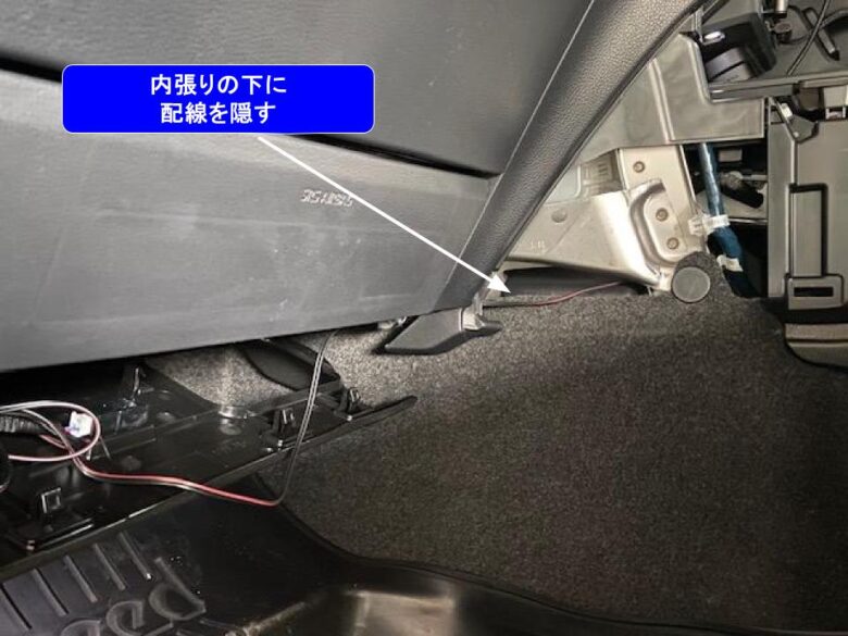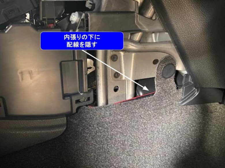 内張り下を通して白枠内に配線を通しました。