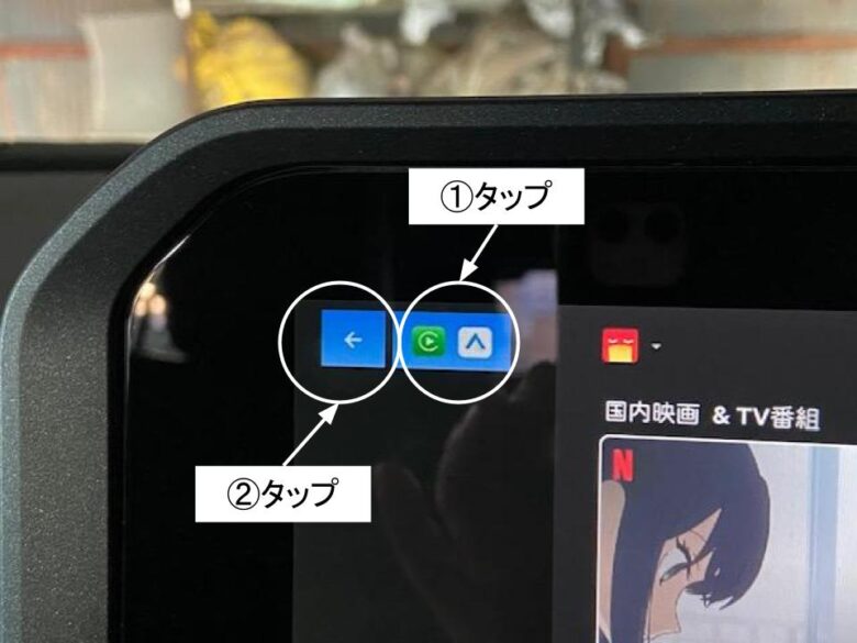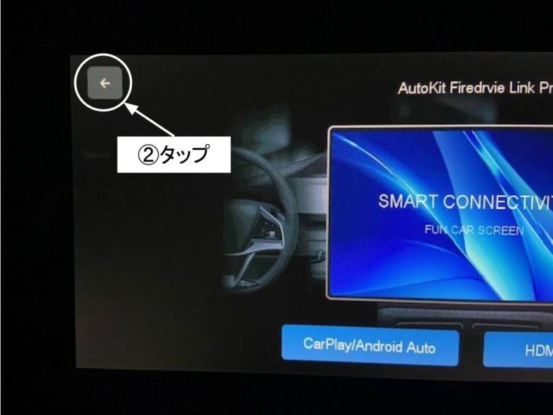 Fire TV Stick画面のどこでもタップすると左上に①CarPlayのアイコンが表示、タップするとCarPlay画面が表示されます。