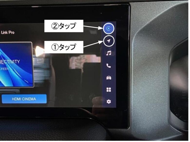ペアリング後にCarPlay画面にならない場合、①ナビをタップ→②CarPlayをタップするとCarPlay画面が表示されます。