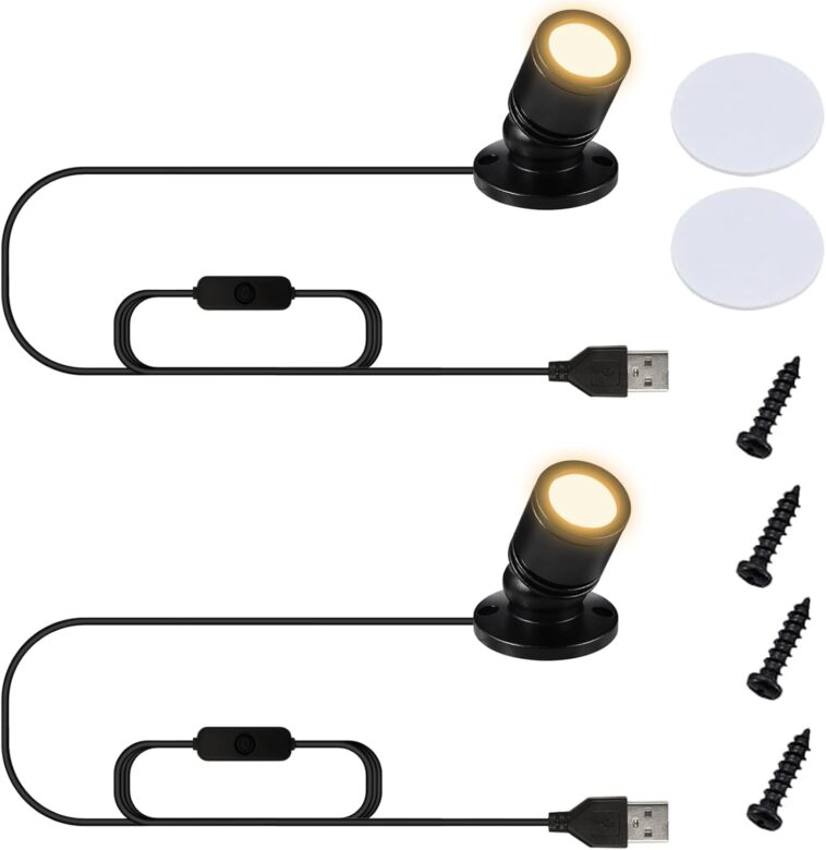 LEDミニスポットライトの取り付けはネジ固定が出来ますが、付属の両面テープで行いました。IKEAで買った飾り棚に取り付けて、配線は棚の後ろにはわしました。