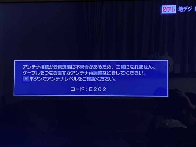 - 202エラー表示:リモコンの「青ボタン」でアンテナレベルを確認する。