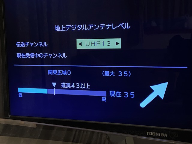 - リモコンからの操作:クイック→その他の操作→アンテナレベル表示→アンテナレベルを確認する。