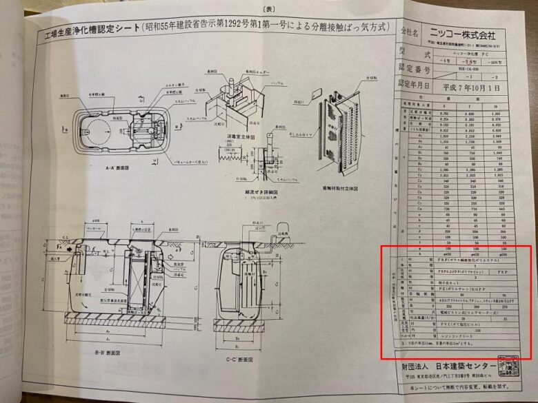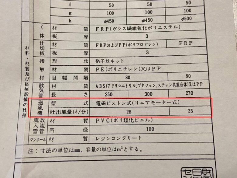浄化槽仕様書を見れば「単独」「合併」「送風機」「吐出風量」などが確認できます。