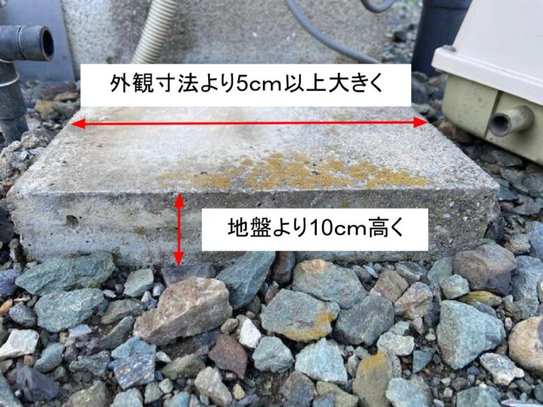 - 据え付け台は地盤より10cm高く、外観寸法より5cm以上大きくする。(水没しないため)
